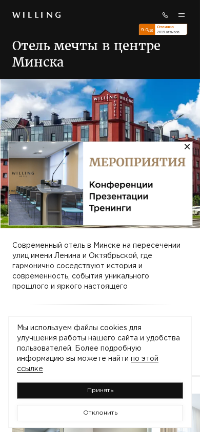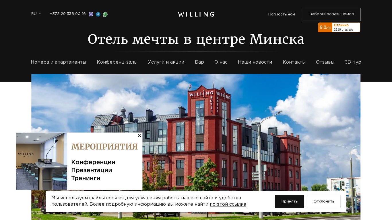 | SEO-описание | Гостиница Willing — уютные номера и апартаменты в центре Минска. ✅ Комфортное проживание посуточно, доступные цены и удобное расположение — забронируйте номер в отеле онлайн. |