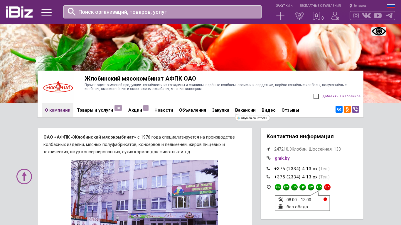 | AI-анализ | This website is for the Жлобинский мясокомбинат АФПК ОАО, located at Шоссейная, 133 in Жлобин, Belarus. The company specializes in the production of meat products, including copčonity (smoked meat) from beef and pork, cooked sausages, vareno-copčonite (partially smoked) sausages, half-smoked sausages, dry-smoked and cooked sausages, and meat canned goods. The website contains information about the company, its products, and contact details. |