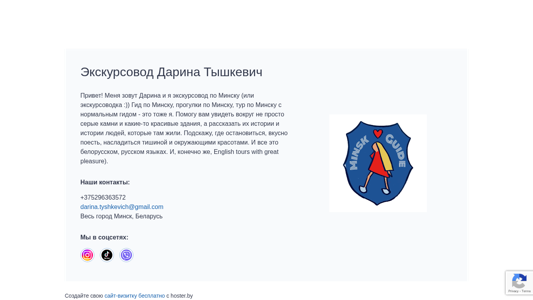 AI-анализ | The web project "Tyshkevich.by" is run by a local guide named Darina Tyshtkevich in Minsk, Belarus. The website introduces Darina as a tour guide offering city tours, walks, and visits to various sites in Minsk. She promises to share the stories behind the buildings and history of the people who lived there. Darina also suggests where to rest, eat, and enjoy the beauty of the surroundings, all in Russian and Belarusian languages with English tours available. The website includes contact information, including a phone number and email address, and invites visitors to check the correctness of their input in several fields before submitting a message. The site is designed to promote Darina's tour guide services in Minsk. |