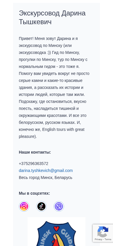 SEO-описание | Привет! Меня зовут Дарина и я экскурсовод по Минску (или экскурсоводка :)) Гид по Минску, прогулки по Минску, тур по Минску с нормальным гидом - это тоже я. Помогу вам увидеть вокруг не просто серые камни и какие-то красивые здания, а рассказать их истории и истории людей, которые там жили. Подскажу, где остановиться, вкусно поесть, насладиться тишиной и окружающими красотами. И все это белорусском, русском языках. И, конечно же, English tours with great pleasure). |