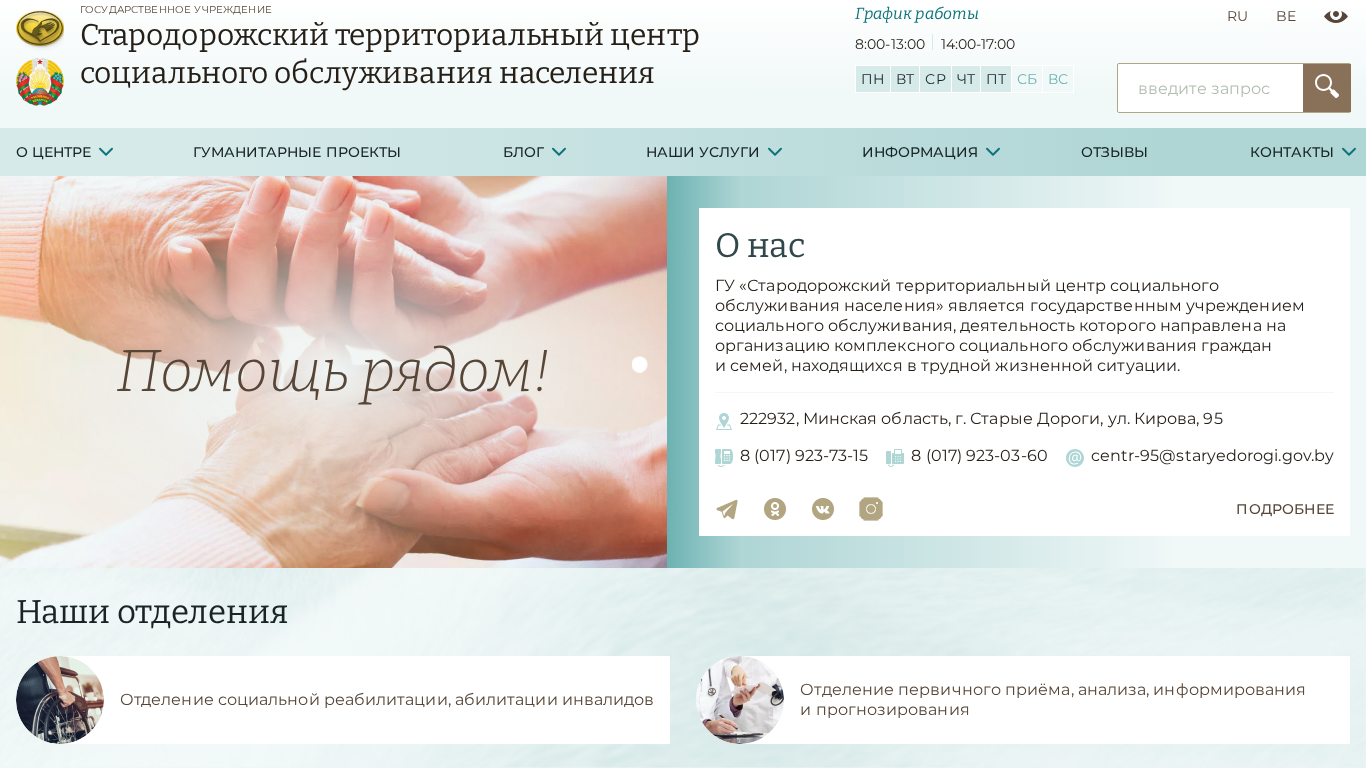 | SEO-описание | Официальный сайт государственного учреждения «Стародорожский территориальный центр социального обслуживания населения» |