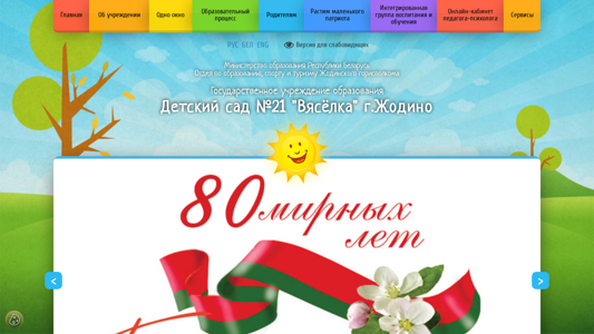 | AI-анализ | --- The web project "Детский сад №21 'Вясёлка' г.Жодино" (du21.zhodino-edu.gov.by) is dedicated to a kindergarten with the title "Детский сад №21 'Вясёлка'" located in the city of Жодино. The website provides information about the institution's administration, staff, operating hours, history, conditions for enrollment, news, and various policies. It also includes sections for vacancies, documents, and contacts. The content highlights the kindergarten's commitment to childcare, education, and safety, with an emphasis on traditions and achievements. Keywords associated with the site include 'September 2025,' Жодино,' education,' иская,' day,' 2026,' safety,' regional,' and 'protection.' |