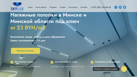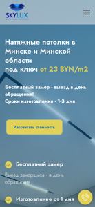 | AI-анализ | The website is for a company offering stretch ceilings in Minsk and the Minsk region, with prices starting from 23 BYN/m2, a free consultation and measurement on the day of inquiry, and a production time of 1-3 days. The site includes information on various types of stretch ceilings, such as white, colored, and textured, with approximate prices provided. The site also mentions a financing option and the possibility of obtaining a new ceiling in as little as one day. Contact information is provided for inquiries. |