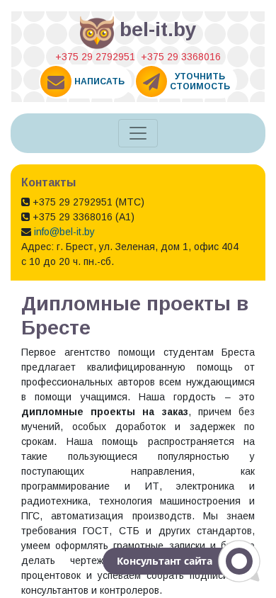 | SEO-описание | Приближается сессия или рабочая комиссия? Помогаем инженерам и не только с их дипломными проектами и работами, курсовыми, контрольными и отчетами по практике. Помощь учащимся из Бреста с гарантией. Качественно, быстро, только опытные специалисты. |