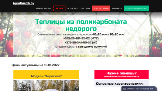 | SEO-описание | Теплицы и парники из поликарбоната в Минске и области. Доставка и профессиональный монтаж. Большой выбор моделей. |