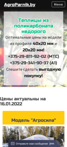 | AI-анализ | The web project Agroparnik.by offers greenhouses and polycarbonate greenhouses for sale in Minsk and the surrounding area. Delivery and professional installation are available. A wide range of models is offered. Keywords: buy greenhouse, Minsk, polycarbonate, delivery, installation, models. The website provides information on various greenhouse models, their sizes, and characteristics. Each model includes details on the frame material, dimensions, number of horizontal braces, and available sizes. The producer is OOO "Selmax Group PK". The website also offers a catalog, information on installation and delivery, and contact information for consultation. The website is in Belarusian language and uses the .BY domain. |