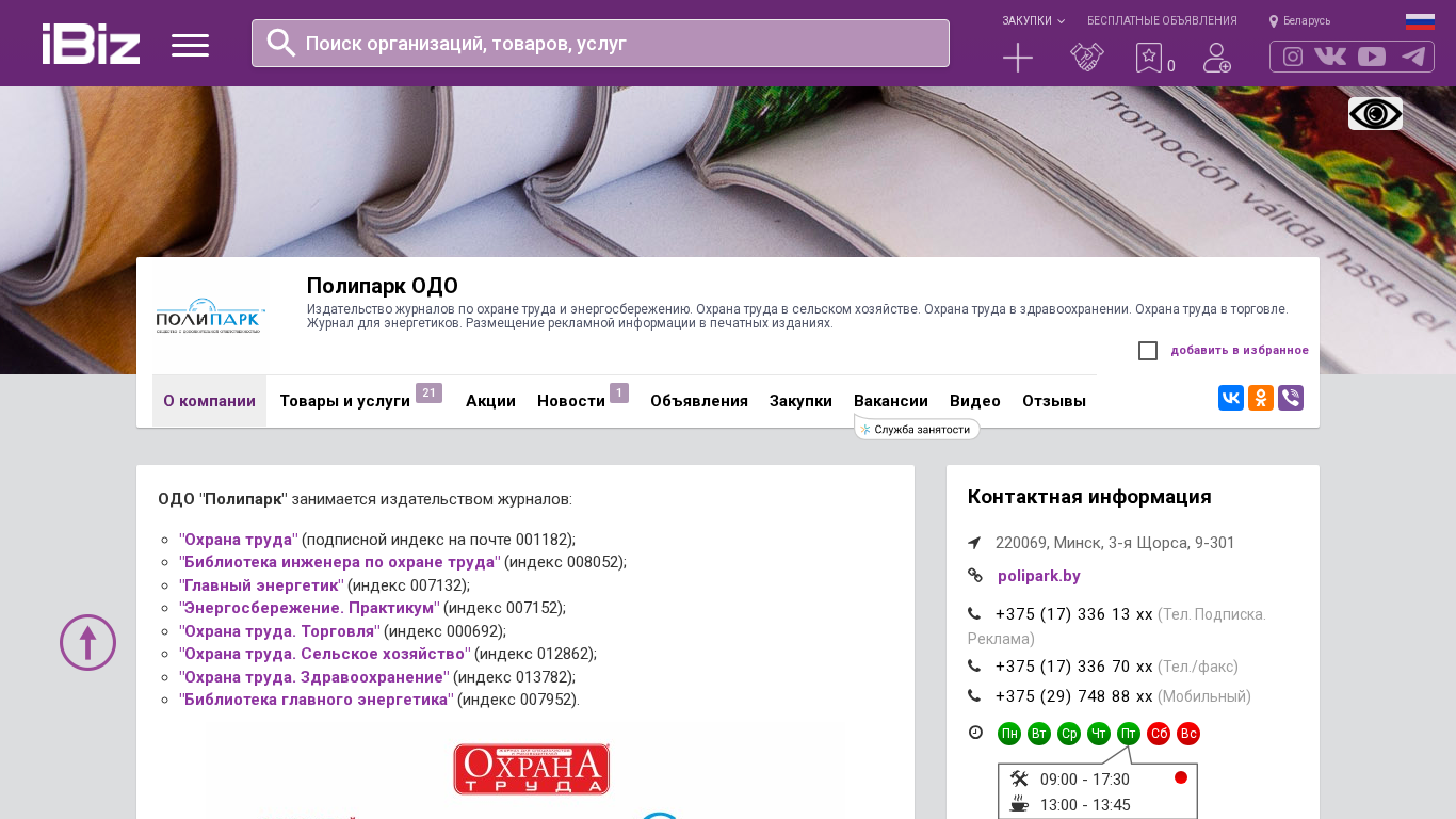 | Название / Заголовок | Полипарк ОДО - Издательство журналов по охране труда и энергосбережению. Охрана труда в сельском хозяйстве. Охрана труда в здравоохранении. Охрана труда в торговле. Журнал для энергетиков. Размещение рекламной информации в печатных изданиях.. 220069, Минск, , 3-я Щорса, 9-301 |