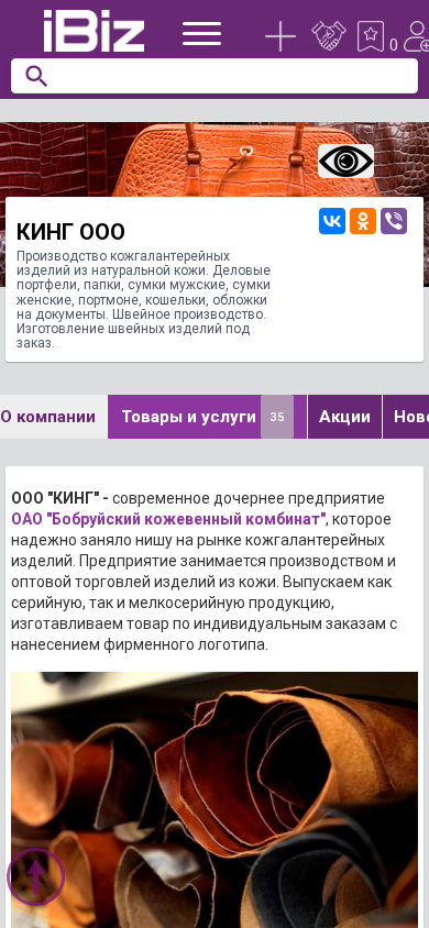 | Название / Заголовок | КИНГ ООО - Производство кожгалантерейных изделий из натуральной кожи. Деловые портфели, папки, сумки мужские, сумки женские, портмоне, кошельки, обложки на документы. Швейное производство. Изготовление швейных изделий под заказ.. 213822, Бобруйск, , Минская, 142А, к. 46 |