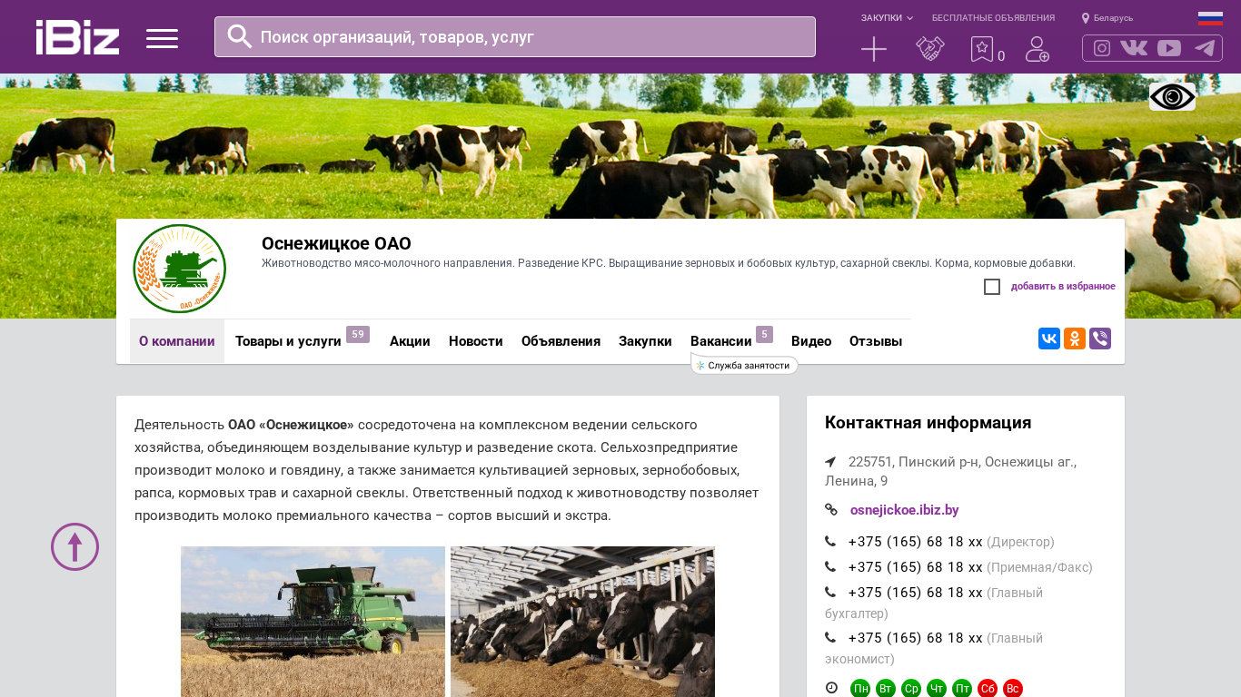 | AI-анализ | The website is for Osnezhickoe OAO, an agricultural company specializing in meat-dairy livestock farming, breeding of dairy cattle, and cultivation of grains, legumes, sugar beets, fodder crops, and corn. The company produces milk and beef, and offers dairy cattle, sugar beets, grains, rapeseed, corn, and livestock feed for sale. The structure of the company includes farming fields, grain storage facilities, a grain drying complex, a transport logistics center, livestock farms for raising and fattening young cattle, repair workshops, and a garage. The company continuously improves through the implementation of modern equipment, automation of processes, reduction of energy and material consumption, and increase in productivity and profitability. The website provides a map for visiting the company and contact information. |