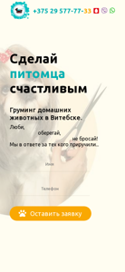 | AI-анализ | --- The website 'groomvit.by' is dedicated to professional pet grooming services in Vitsebsk, Belarus. The certified specialist offers various services for pet care, including trimming, bathing, and teeth cleaning. Keywords associated with the website are 'shaggy', 'grooming', 'Vitsebsk', 'pet', 'services', 'bathing', 'trimming', 'teeth', 'haircut', 'cleaning', 'pets', 'professional'. The website also offers a portfolio of their work and the option to leave a request for their services, along with contact information. The tagline, 'Make your pet happy', emphasizes their commitment to providing quality care for household pets. The services provided include trimming fur between paw pads, intimate area grooming, bathing with professional shampoos and conditioners, drying and |