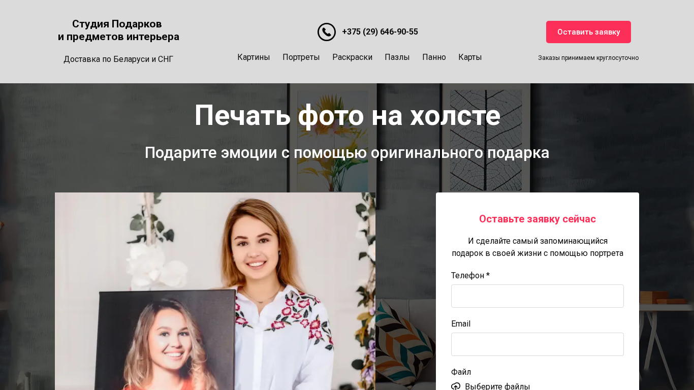 | SEO-описание | Печать фото на холсте. Картины из фото на заказ за 1 день с доставкой по Беларуси. Оригинальный подарок для ваших близких. |