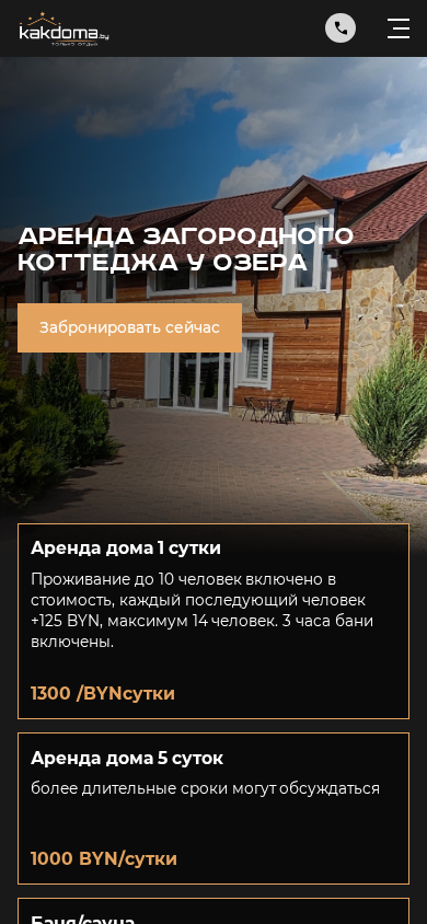 | AI-анализ | --- The portal kakdoma.by offers a cottage for rent by the lake in the Logoyskiy district, with a sauna and a large area for games and relaxation. It can accommodate up to 14 people. The cost includes accommodation for 10 people, with each additional person costing an extra 125 BYN. The cottage is available for rent for one day, with longer stays negotiable for 1000 BYN per day. The sauna can accommodate up to 8 people and costs 500 rubles for 3 hours, with additional costs per hour and person. The cottage is only available for rent on weekdays, and group events (such as weddings, birthdays, and corporate events) are handled on a case-by-case basis for up to 40 people, starting at 1500 BYN. The cottage is a |