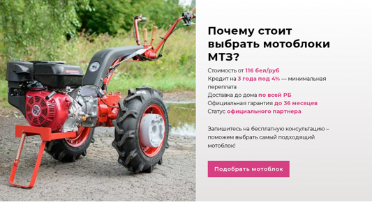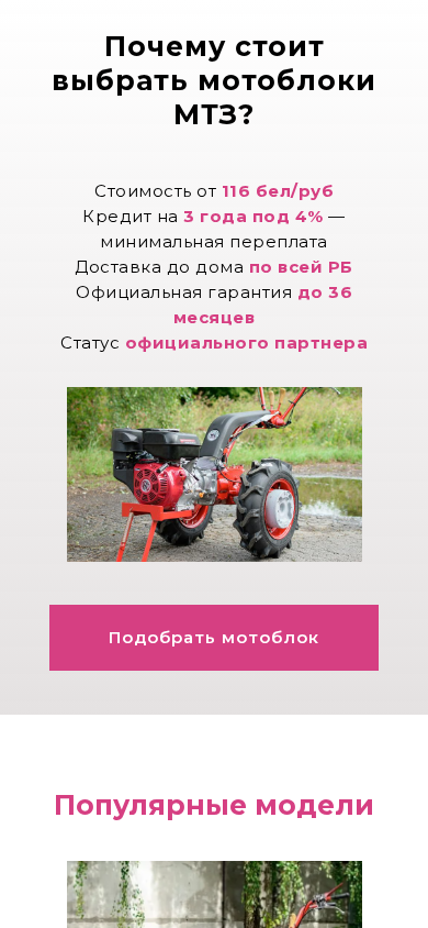 | AI-анализ | The portal Motobloktut.by offers visitors assistance in selecting a MTZ branded motorblock based on their specific needs and budget. The website provides detailed information about various models, including their power and recommended land area, as well as an option for a free consultation with a manager. Prices for MTZ motorblocks start from 116 BYB/BYR, with a credit offer available for up to 3 years at 4% interest. Delivery to the customer's home is included in the offer, and all products come with an official warranty of up to 36 months. Popular models on the site include the Weima WM177F, Motobлок MTZ Belarus 09H-02, and Weima 188F, each with different power outputs and recommended land areas. Users can answer a few questions to receive a |
