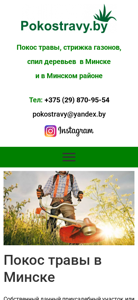| AI-анализ | The website "Покос травы в Миnске и Минском районе" (Lawn Mowing in Minsk and Minsk Region) offers affordable lawn mowing services for residential and recreational areas in Minsk and Minsk region. The services include lawn mowing, tree pruning, and aerialization (scarification). The contact information is provided: phone number +375 (29) 870-95-54 and email pokostravy@yandex.by. The website also mentions the prices for lawn mowing in Minsk. The text emphasizes the benefits of lawn mowing for both the aesthetic and practical aspects, such as reducing fire hazards, controlling unwanted weeds, and maintaining cleanliness. Two methods for lawn mowing are mentioned: mechanized and using a trimmer. The mechanized method uses specialized equipment |