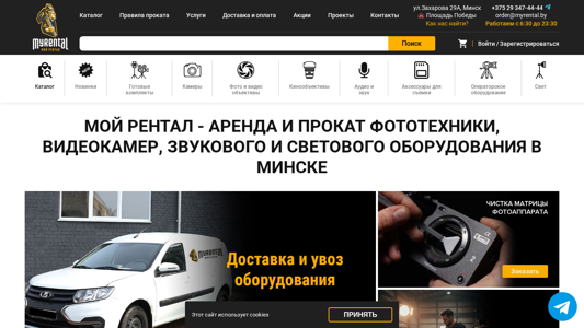 | AI-анализ | The portal Myrental is a rental service for photo and video equipment, lighting and sound equipment in Minsk, Belarus. It offers a wide range of choices in photo, cinema, and video technology, as well as lighting equipment. The competent staff is available 24/7. Keywords associated with the site include 'rent', 'Minsk', 'equipment', 'camera', 'video', 'lighting', and 'sound'. The site has sections for catalogs, rules of rental, services, delivery and payment, promotions, projects, and contacts. The contact information includes an address on ul.Zakharova 29A in Minsk, a phone number of +375 29 347-44-44, and an email address of order@myrental.by. The business operates from 6:30 to 2 |
