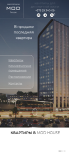 | AI-анализ | --- The website Mod House presents a premium-class residential building located at the beginning of Dzerzhinsky Prospect, 12, providing easy access to major transportation arteries and proximity to a new metro station. The building offers 111 apartments on floors 3-5 and 96 parking spaces in the underground garage. The complex includes a closed sports area, a landscaped terrace, and a children's playground. Access to the underground parking lot is secured, and the building features a unique architectural design with expansive panoramic windows offering stunning city views. The residence boasts a closed, secure territory, author's entrance groups, and a variety of apartment sizes, from compact to spacious, with the largest measuring 207 m² and the smallest at 54 m². The building is located 4 minutes from the metro station and 5 minutes from Neh |