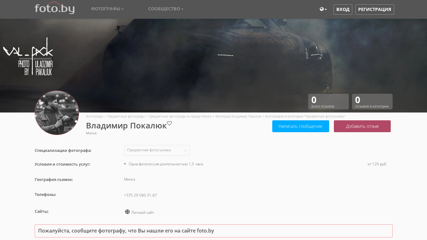 | SEO-описание | Фотографии в категории "Предметная фотосъемка". Сайт фотографа Владимира Покалюка. Работаю во многих видах съёмки в городе Минск. Большой практический опыт и только профессиональное оборудование - залог отличных кадров. |