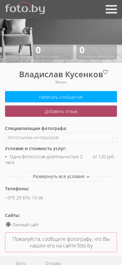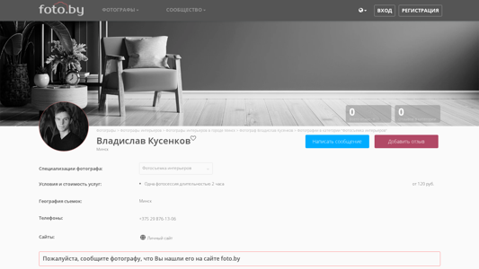 | AI-анализ | The website is a portfolio for photographer Vladislav Kusenkov based in Minsk, Belarus. The site focuses on interior photography, as indicated by the title and description keywords. Visitors can find information about various photography categories, including interiors, and contact the photographer for services. The site includes a community of photographers, with options to view all works, blog, and announcements. The interface allows users to switch between the catalog of photographers and the community of photographers as the main page. The website was visited on May 20, 2025, with no reviews found in the interior photography category. The photographer's specialization is interior photography, and pricing and contact information are available on the site. The site is part of the Foto.by network. |