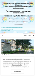 | AI-анализ | This online resource belongs to the website of Kindergarten No. 4 in the city of Mstislavl, managed by the Ministry of Education of the Republic of Belarus and Mstislavl Regional Executive Committee. The title of the website is "Детский сад №4 г. Мстиславля" (Kindergarten No. 4 of Mstislavl). The website provides information about the kindergarten's schedule, which operates from 7:00 AM to 5:30 PM, with weekends off. The contact information includes the email address sad4mstislavl@mstroo.by and the phone number +375(2240)-52-450. The website includes an administration section with a specified work schedule and a virtual tour. The kindergarten offers various services such as pedagogical personnel |