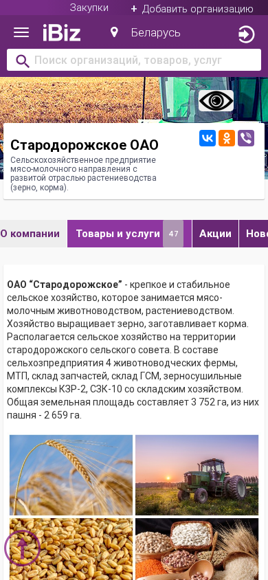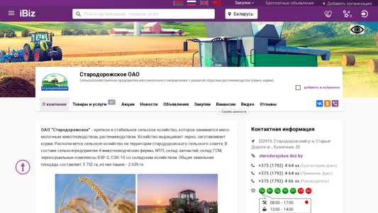 | AI-анализ | The website is for Starodorozhskoe OAO, a farming enterprise focusing on meat-dairy and crop production. The organization is located in the Starye Dorogi agricultural community, at the address Кузнечная, 20. The website includes a map for navigation, contact information, and the address of the company. Starodorozhskoe OAO specializes in livestock farming, crop cultivation, particularly grains and animal feed. The farming enterprise consists of four livestock farms, a machinery and repair workshop, a grain storage facility, and zernosushechnye kompleksy (grain drying complexes). The total land area is 3,752 hectares, with 2,659 hectares dedicated to farming. The company produces and sells meat from cattle, milk from cattle, cattle, gr |