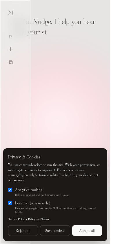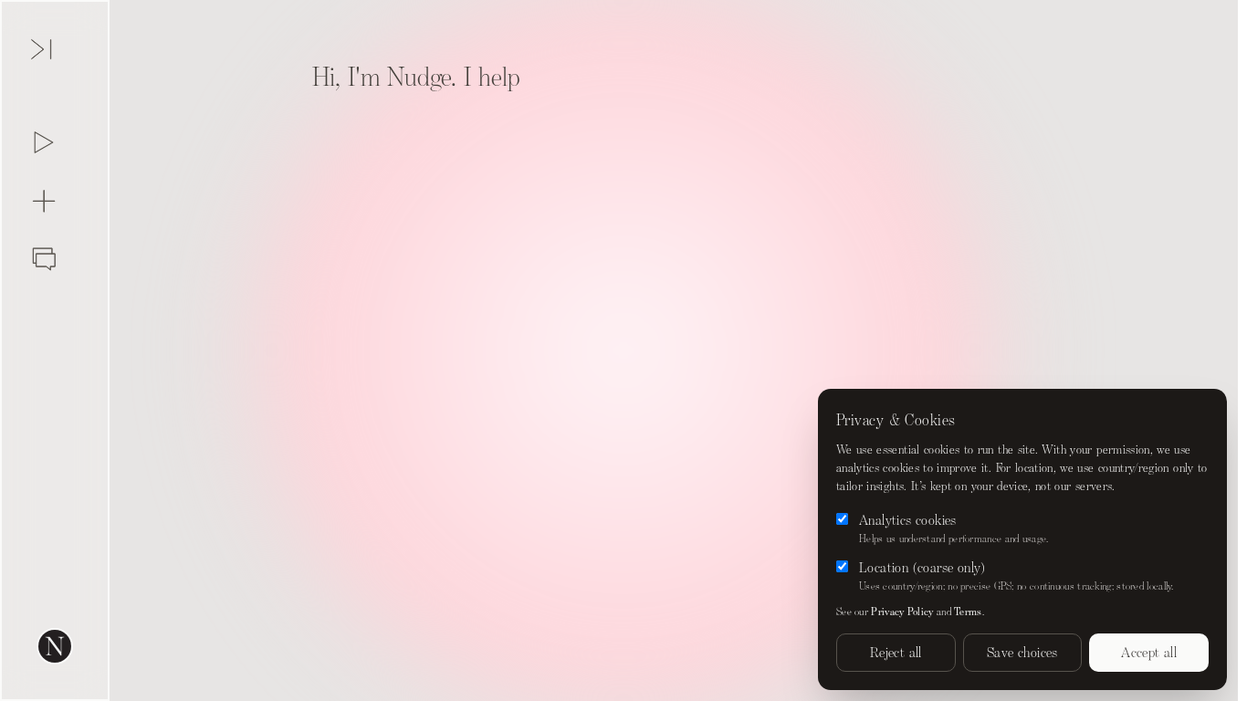 | AI-анализ | The website 'Nudge.by' is titled 'Get Started with AI - Nudge Analytics' and is described as a platform that assists users in getting started with AI analytics through the use of an intelligent onboarding assistant. The domain primarily focuses on keywords related to analytics, use, with, privacy, location, country, region, only, our, and, all. The website features an option for live chat, a new chat history, pricing information, and links to a login, help, privacy policy, and terms page. It utilizes essential and analytics cookies to operate and improve its performance, while only using country/region information for location-based tailoring. Users can choose to accept or reject these cookies. |