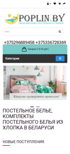| AI-анализ | The portal Poplin.by is an online store for bedding accessories in Minsk, Belarus. Delivery is available throughout Belarus. Shop for cotton, poplin, satin, and natural silk at discounted prices. Keywords: bedding, sheets, blankets, pillows, duvets. The website offers a personal cabinet with registration and login features, saved bookmarks (0), and an empty shopping cart. Categories include cotton sheets, children's bedding, and poplin. There are images of product packaging displayed. The store sells a 'Marianna' premium set, 'Sharm - Grand' duvet, 'Atlas 3D' silk duvet, 'Monica' collection bedspread, and various bedding accessories. Additionally, there are sections for information on cotton and delivery options. The store features a range of bedding products for purchase. |