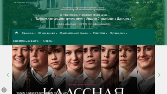 | AI-анализ | The portal "Dubno Secondary School named after Andrey Stepanovich Danilov" is an educational institution website in Belarus, located in Dubno, on Shkolnaya Street 9. The site is managed by the Ministry of Education of the Republic of Belarus and the Minsk Oblast Education Administration. It provides information on the school's schedule, leadership, normative documents, phone numbers, and administrative procedures for citizens. The website also features sections for news, pedagogical personnel, graduates, and a parental council, as well as information on the school's achievements, anti-corruption efforts, and the information and bibliographic center. Visitors can find details about the school's curriculum, exams, and opportunities for teacher training and student employment during free time. The site also includes a section for parents, with information on recommended supplies, parent university, and rules for |