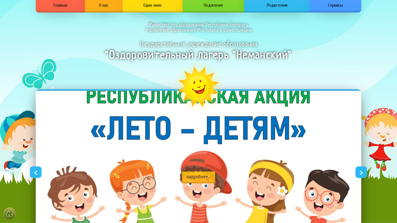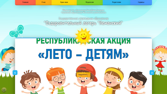 | AI-анализ | This online resource is the official website for the "Neman Health Camp" in Belarus. It provides detailed information about the camp's structure, schedule, admission process, and contact details. The website includes sections for news, administration, humanitarian cooperation, and practical information for parents. Visitors can also find documents and materials related to the camp, as well as a calendar of state holidays and a registration form for teachers. The site features information about the camp's schedule, including the dates and durations of various sessions throughout the year. Additionally, parents can find advice from a psychologist and information about what to bring to the camp. The website is organized into various sections, including "About Us," "News," "Admission," and "Contacts." It also includes a calendar of camp sessions and a map of the region to help parents plan their visit. The website is operated by the "State Educational Institution 'N |
