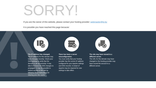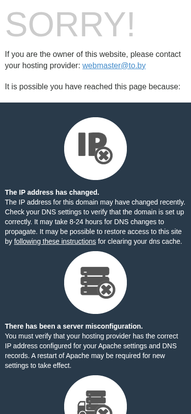 | AI-анализ | language: by This online resource, titled "Default Web Site Page," is associated with the Belarusian .BY domain to.by. The description section is blank, and the keywords consist mainly of common English words such as "the," "may," "for," "this," "have," "dns," "site," "you," "hosting," "provider," "address," "has," "changed," "domain," and "settings." The content of the page is an error message, which suggests that recent changes to the domain's IP address or server configuration may have caused issues with accessing the site. The message advises users to verify their DNS settings, clear their DNS cache, or contact their hosting provider for assistance. The language of the site is Belarusian. |