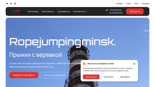 | AI-анализ | Please note: The data provided is a snapshot and might not represent the current state of the website. The website Ropejumping.by is a platform for rope jumping activities in Belarus. It offers jumping opportunities from various heights, including 13, 35, 72, and 100 meters, using certified equipment and experienced instructors who are also expert alpine climbers. The website features a blog, a gallery, a schedule of events, and information about their objects and certificates ensuring safety. Visitors can book jumps and find the latest schedule on the website. The site also includes testimonials from satisfied customers praising the organization and safety measures. The highest jump currently offered is 100 meters, making it the tallest jump in all of Belarus. The website uses cookies for proper functioning and has an option to reject or customize them. |