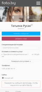 | AI-анализ | The portal is a photography website belonging to Tatiana Rusak, a family photographer based in Dzerzhinsk, Belarus. The site features a category dedicated to 'Family Photoshoots.' Tatiana Rusak specializes in family photography, Love Story sessions, and children's photoshoots. The site lists her contact information, including a phone number and personal website. The platform allows users to write reviews and view other photographers' portfolios. The website also includes information about pricing, session duration, and geographical coverage. Users can find Tatiana Rusak's profile by searching for family photographers in Dzerzhinsk. |