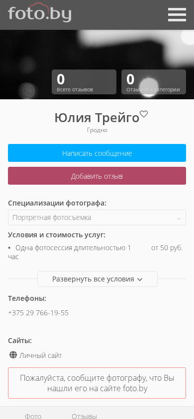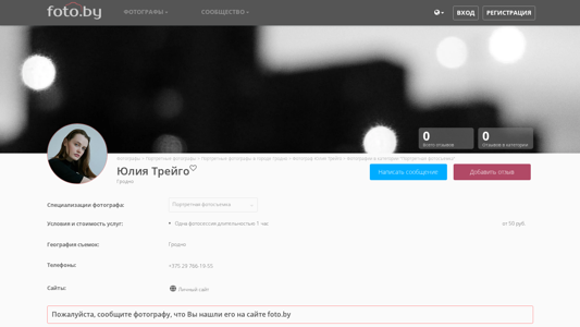 | AI-анализ | The portal is a photography website dedicated to the work of portrait photographer Julia Treygo from Grodno, Belarus. The site features a catalog of photographers, with Julia's portfolio listed under the 'Portrait Photography' category. She offers her services as a portrait photographer in Grodno. The website includes a blog, community forum for photographers, and various categories for different types of photography. Users can leave reviews for photographers, view their portfolios, and contact them through the site. The site also includes information on pricing and shooting conditions. The domain is trejgo.foto.by. |