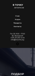 | AI-анализ | The website Автокраски В ТОЧКУ is a car paint selection service based in Vitsebske, Belarus. It offers materials for body repair using SPECTRAL and NOVOL brands. The website provides detailed information on paint selection with the use of a spectrophotometer and the availability of various materials for body repair, ranging from abrasives to protective coatings. Customers can also find information on the shop's location and contact details. The store's offerings include a wide range of materials for body repair, such as shapatlevki, laks, grounds, auto enamels, overcoats, and primers. The website also mentions the availability of polishing services using Poliroli, ZM, Surf-ACE, and Quattro products. The shop is located on the entrance of the South parking lot of the PK "Yuzhnaya" in |