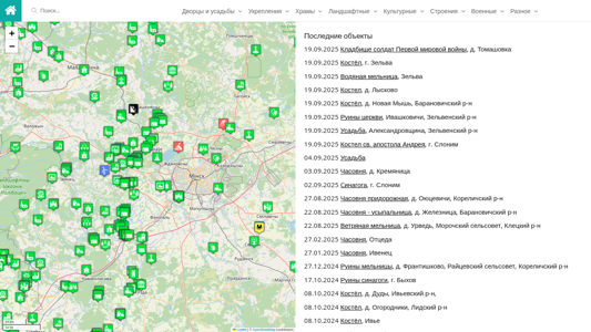 | AI-анализ | --- The portal kudin.by provides information about notable sites in Belarus. Topics include palaces and estates, fortifications, defensive churches, synagogues, cemeteries, churches, chapels, landscapes, earthworks, quarries, lakes, caves, suspension bridges, springs, terraces, cultural memorial complexes, museums, monuments, barns, arch bridges, towers, gates, breweries, wind and water mills, stables, ice houses, and various other structures. The data covers sites in various regions of Belarus, including Zhelva, Lyskov, Novaya Mysh, Ivaschovichi, Zelyenovsky r-n, Slohim, Kremenitsa, Oyutsevichi, Zelva, Alexandrovschina, and others. Some sites mentioned are the Church in |