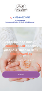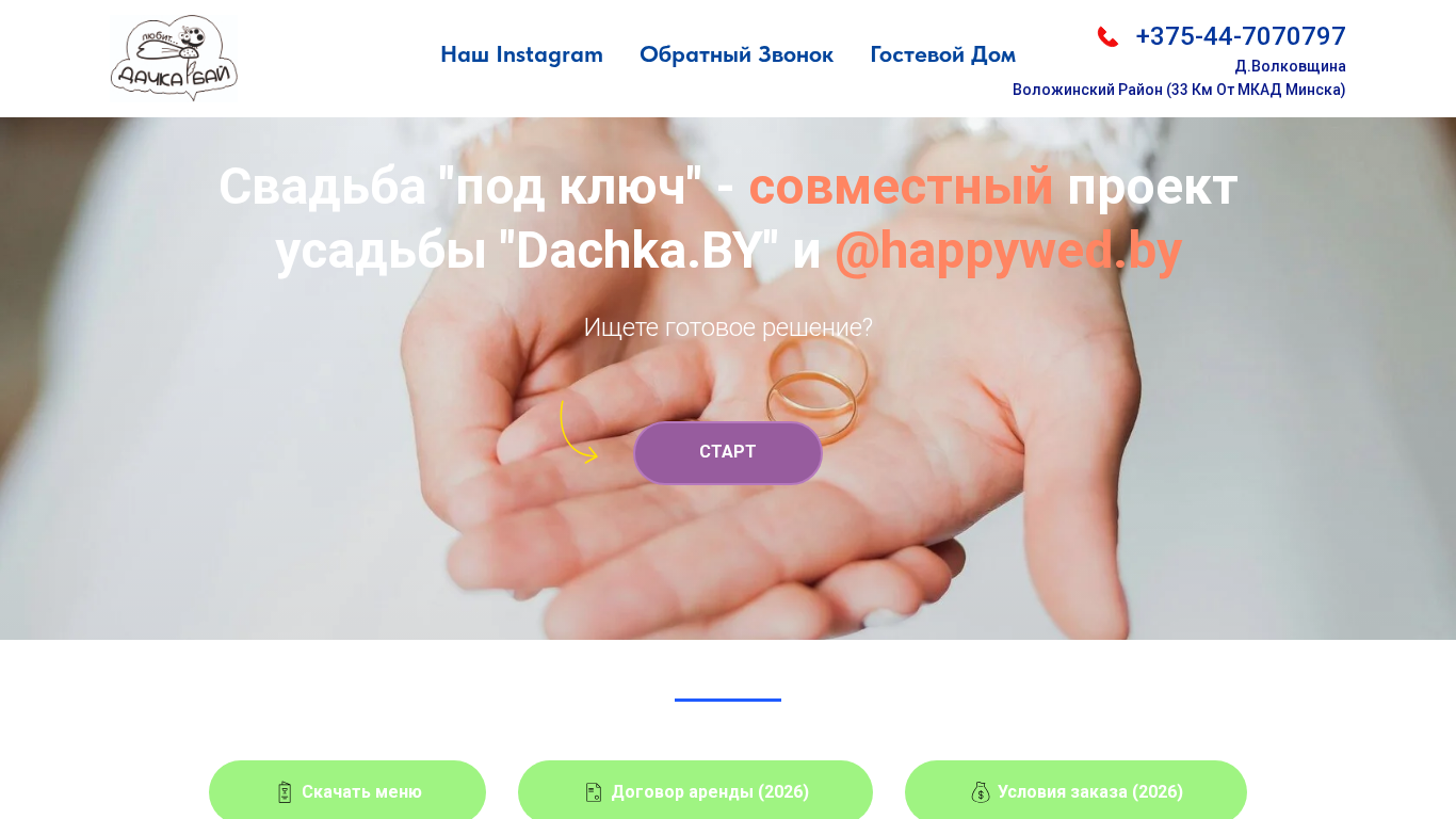 This online resource, titled "Дачка.бай" (Dachka.BY), is an event venue and accommodation website located in the village of Волковщина, in the Volozhinsky district, 33 km from the MKAD of Minsk, Belarus. The website offers a wedding venue in a manor house setting, with a guest house for accommodation and catering services. The description mentions the beauty and convenience of the location, and the availability of a guest house and tasty food. The website appears to offer a "turnkey" wedding solution in partnership with the wedding planning company "happywed.by". The venue is located by turning right at the 36th kilometer marker on the M6/M7 highway towards Раков-Радошковичи, passing through the villages of Бузуны and Волковщина, or by