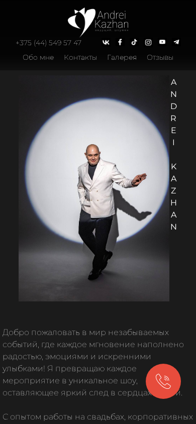 | AI-анализ | The web project "Andrei Kazhan Showman" is a website dedicated to the activities of Andrei Kazhan, an events and party host. The title of the website reflects the name of the person. The description tag includes keywords related to the profession of a host, such as "ведущий" (host), "мероприятий" (events), and "праздника" (party). The most frequently used words on the website are "андрей" (Andrei), "каждый" (every), "кажан" (Kazhan), and "праздник" (party). The website also includes sections for contacts, a gallery, testimonials, and a blog. Andrei Kazhan positions himself as a creator of unique and memorable events, able to engage and entertain all guests. With experience in hosting weddings, corporate events, and birthday parties, he prides himself |