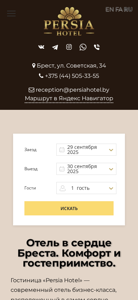 | SEO-описание | Добро пожаловать в гостиницу «Persia Hotel» - оазис элегантности в центре Бреста. Мы предлагаем уникальный комфорт, изысканные номера и высочайший уровень обслуживания для каждого гостя. |