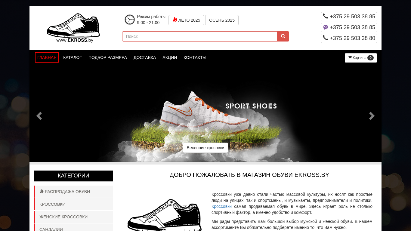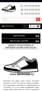 | AI-анализ | This website is an e-commerce platform for men's and women's footwear, specifically selling sneakers, sandals, flip-flops, boots, and other types of shoes. The website offers free delivery within Minsk, Belarus. The title is "Интернет-магазин мужской и женской обуви EKROSS.by" and the description includes keywords such as "интернет магазин обуви," "купить мужскую обувь," and "мужская обuвь." The top_words indicate that 'кроссовки' (sneakers) are the most frequently mentioned item, followed by 'корзину' (cart), 'руб' (ruble), and '375' (Belarus country code). The website also includes a phone number, business hours, |