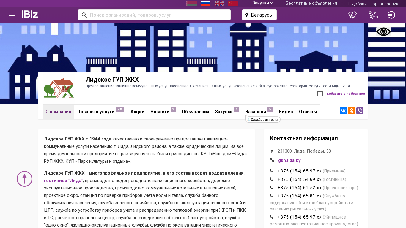 | Название / Заголовок | Лидское ГУП ЖКХ - Предоставление жилищно-коммунальных услуг населению. Оказание платных услуг. Озеленение и благоустройство территории. Услуги гостиницы. Баня.. 231300, Лида, , Победы, 53 |