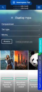 | AI-анализ | This online resource, titled "Экваториал-тур" (Equatorial-tour), is a Belarusian website dedicated to tourism services. The description includes keywords related to various travel destinations, such as countries (Australia, Algeria, Antarctica, etc.), holidays (New Year, Carnival, etc.), and types of tours (safari, cruise, etc.). The website offers services ranging from vacation packages to transportation tickets and visas. Users can search for tours by country, type, or date, and find information on various travel-related topics like currency exchange and border control. The website also includes a catalog of tours to various destinations, with sections for exotic fruits, transportation services, and travel tips. The domain is registered in Belarus (.by). |