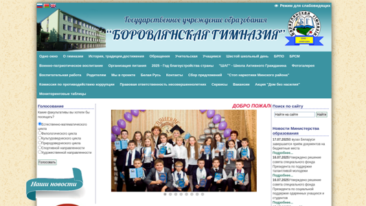 | AI-анализ | language: be (Belarusian) The portal bor-gym.minsk.edu.by is a Belarusian language educational website titled 'Боровлянская гимназия : Добро пожаловать!' (Borovlyanskaia gimnaziia: Dobro pozhalovat!). The description tag mentions keywords related to a school, such as 'учителей' (teachers), 'учащихся' (pupils), and 'гимназия' (school). The top words indicate that the website is about a specific school, 'Боровлянская гимназия' (Borovlyanskaia gimnaziia), and includes mentions of various events and organizations. The domain is registered in the .BY top-level domain, indicating that it is based in Bel |