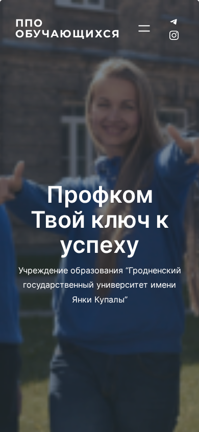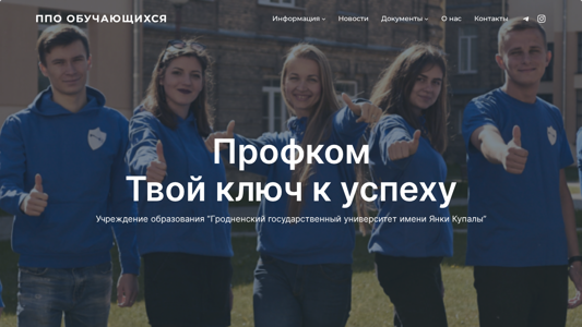 | AI-анализ | The web project "ППО Обучающихся" (prkom.grsu.by) is a website associated with the educational institution "Гродненский государственный университет имени Янки Купалы" (Grodno State University named after Yankee Kapelya). The site provides information on various aspects of the university, including news, documents, and contacts for the Profsouz (Professional Union) of students. Key topics include membership, frequently asked questions, abonements, and news. The website features announcements of recent events such as a "вожатского мастерства" (leadership contest) and a "Война в истории семья Макаровых" (War in the Family of the Makarovs). The site also includes information on the members of the Profsouz committee and their roles, as well as |