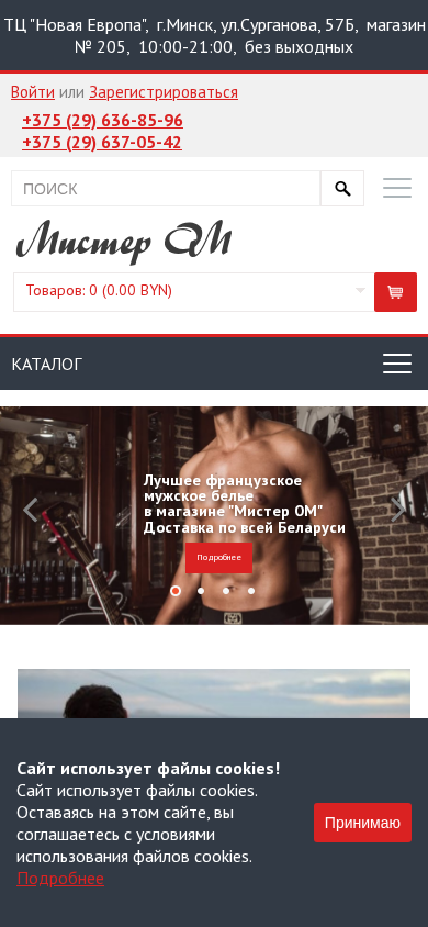 | SEO-описание | Мистер ОМ предлагает мужское белье и одежду для дома и отдыха европейских брендов HOM, IMPETUS, Ceceba, Gotzburg, Cornette. Заходите: ТЦ "Европа" г. Минск, ул.Сурганова, 57Б, магазин № 205. |