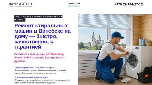 | SEO-описание | Ремонт стиральных машин в Витебске — выезд мастера на дом, замена подшипников, тэна, модуля, платы, резинок, устранение протечек, ошибок и т.д. Ремонт стиральной машины Атлант, LG, Indesit, Samsung, Bosch, Электролюкс и других брендов. Мастер по ремонту стиральных машин с опытом 12 лет. Цены от 25 рублей. Звоните ☎️ +375 29 144-27-12. Супер Мастер |