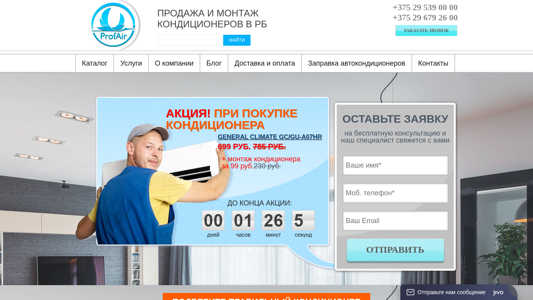 | AI-анализ | This website is an e-commerce platform for purchasing and installing air conditioners in Belarus. The title suggests buying a conditioner in Mozir and the description offers conditioners for sale in apartments across Belarus, with low prices and delivery. Keywords include conditioners, prices, and delivery, while top_words relate to power, installation, and various brands. The catalog features split systems and inverter conditioners, with an option for multisplit systems. Services such as project planning, equipment selection, installation, and servicing are also offered. The company information includes certifications and client reviews, with contact details and a blog. The homepage displays various promotions and a call-to-action to "Order a consultation" or "Choose the right conditioner". The user can filter their selection based on room size, type, conditioner type, working mode, and price. An ongoing promotion offers a discount on |