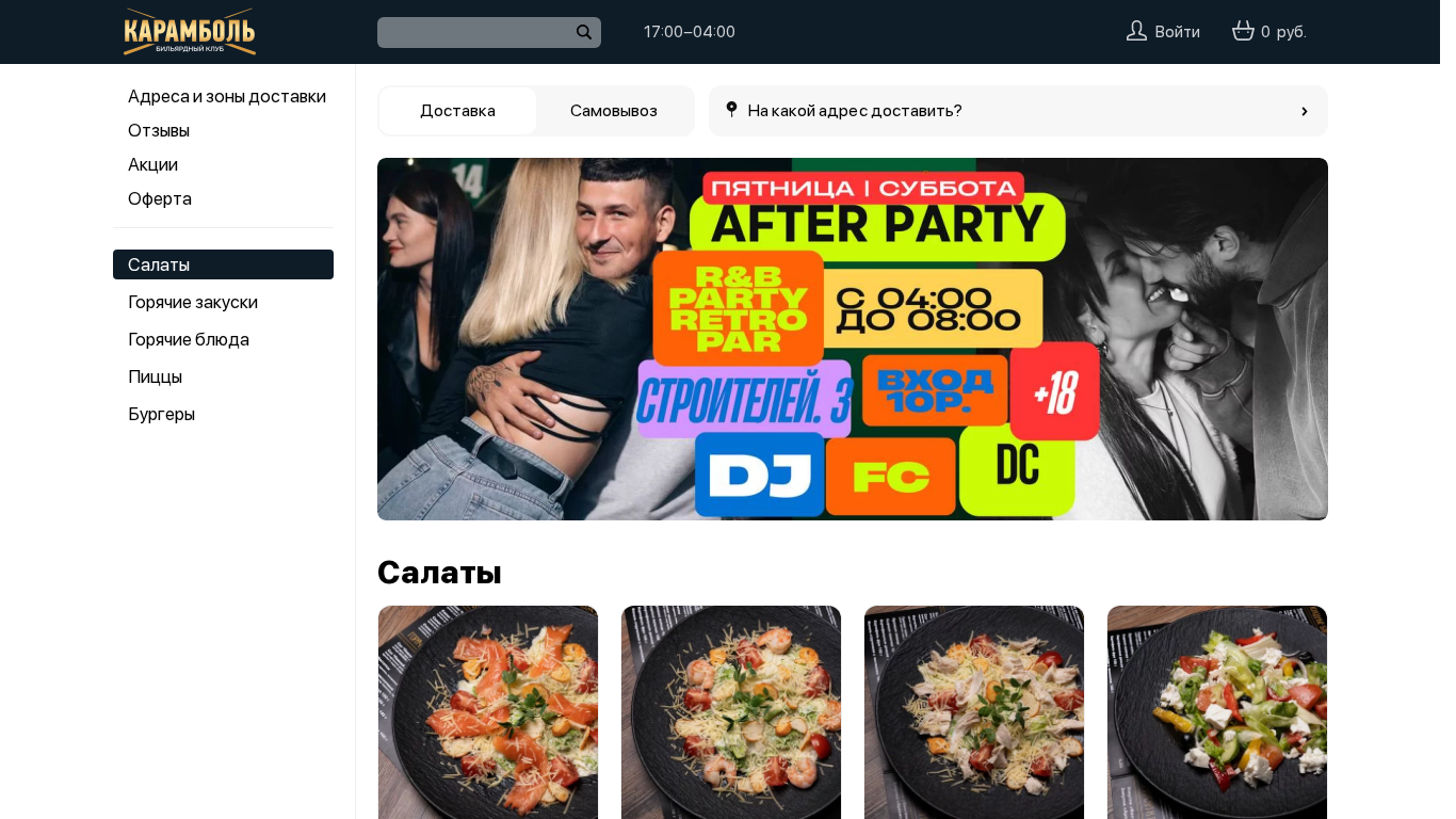 | AI-анализ | The portal karambol.by is a food ordering and delivery website. It features a menu with various options that may differ depending on the delivery address. The website offers salads, hot appetizers, main dishes, pizzas, and burgers for delivery or self-pickup. Salad options include Caesar salad with fish, shrimp, or chicken, and Greek salad. Hot appetizers include a set with French fries, onion rings, garlic bread, and sausages, as well as separate offerings for sausage, garlic bread, onion rings, and cheese sticks. Main dishes include offerings with pork ribs and chicken schnitzel, priced from 17 to 37 rubles. The website also offers various sides, including black bread with parmesan cheese, and mashed potatoes. Prices range from 6 to 33 rubles. |