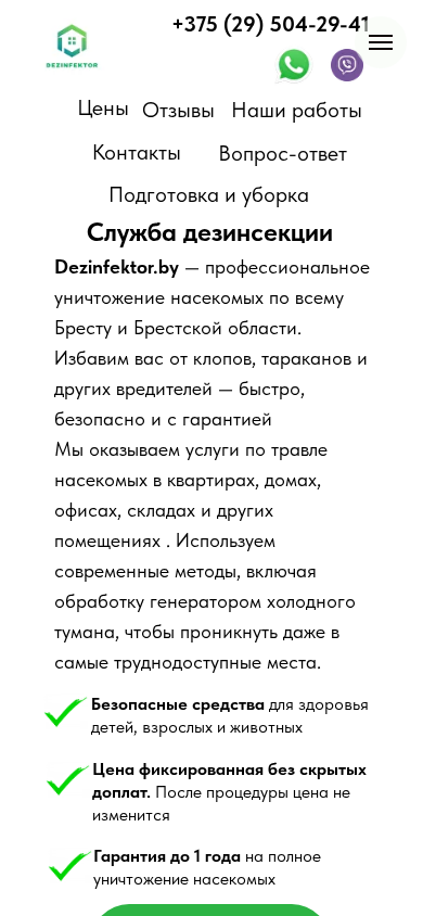 | SEO-описание | Доступная стоимость дезинсекции участков, домов, квартир и помещений ✔️Служба дезинфекции от насекомых в Бресте ✔️ Гарантия до 1 года ✔️ Безопасные средства для детей, взрослых и животных. |