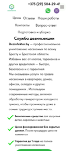 | AI-анализ | The website is a pest control service offering de-infestation services in Brest, Belarus. The website provides information on the availability and pricing of de-infestation services for various areas including yards, homes, apartments, and rooms. The company offers a one-year guarantee, uses safe chemicals for children, adults, and animals, and accepts 24/7 inquiries and calls from 8:00 to 22:00. The website lists various pests that can be eliminated such as ants, cockroaches, bed bugs, fleas, flies, silverfish, beetles, and spiders. The website also includes a FAQ section, contacts, and a privacy policy. |