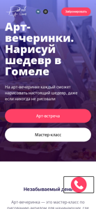 | AI-анализ | The web project "Рисуем шедевры в Гомеле" (Risuem.by) offers art parties and master classes for painting in Gomel, Belarus. Each participant can create a masterpiece even without previous experience. The studio, called "Рисуй" (Risuy), is a creative art studio providing art parties and master classes in Gomel, known for its high-quality delivery, professional approach, and unique master class programs. The studio uses only professional materials and works individually with each participant, ensuring that every attendee leaves with their own masterpiece. The art party lasts for three hours, including a 5-minute break. The cost includes drinks (water, tea, coffee) and sweets (cakes, candies). Participants can bring their own snacks and drinks or order from the studio's partners. The master class covers three hours |