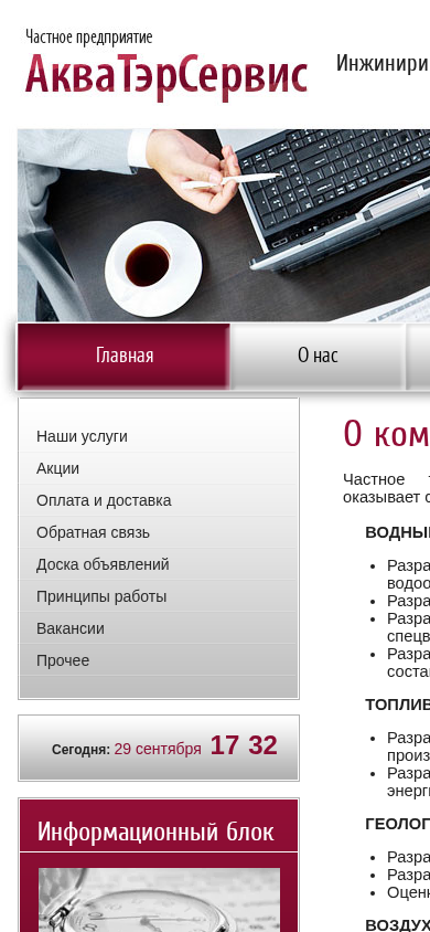 | SEO-описание | ЧП АкваТэрСервис занимается разработкой индивидуальных технологических нормативов водопотребления и водоотведения |